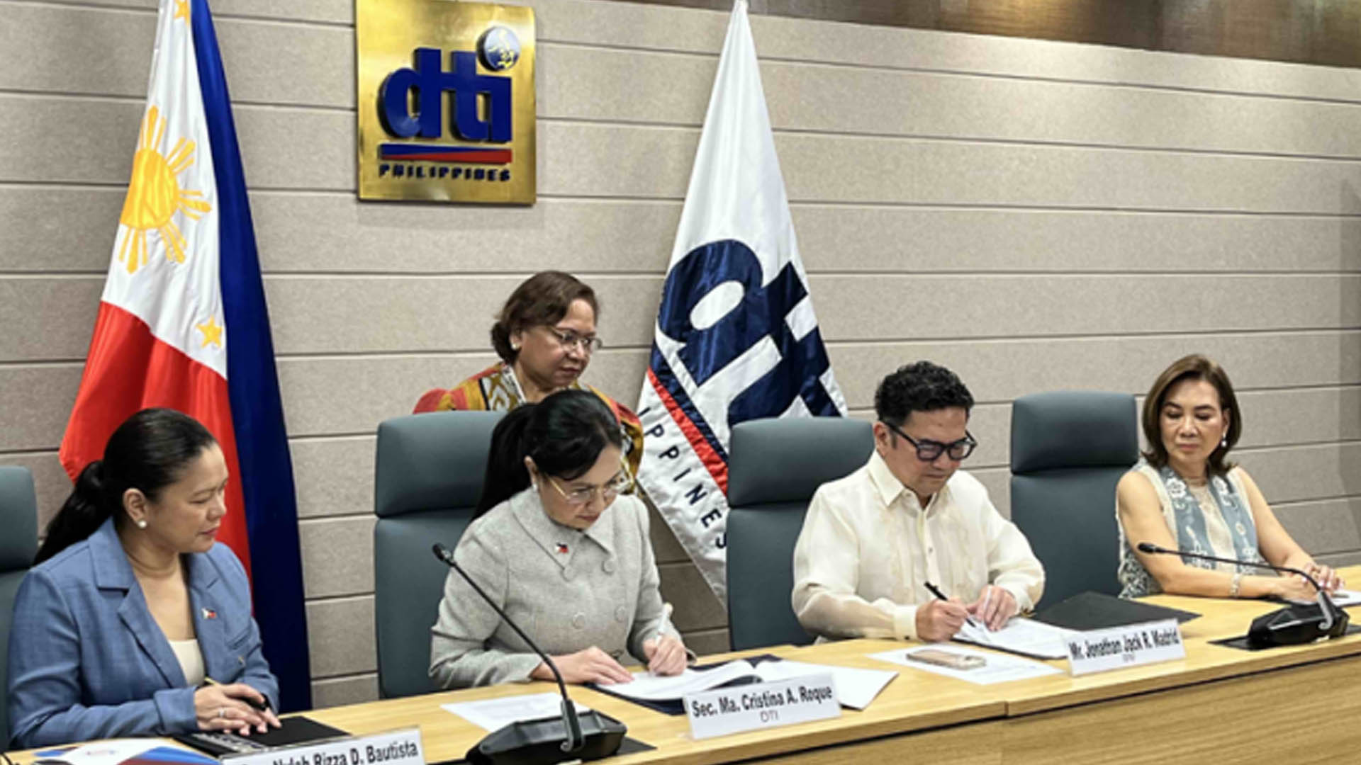DTI Secretary Ma. Cristina Roque and IBPAP president Jack Madrid led the signing of a memorandum of understanding (MOU) at the DTI headquarters in Makati City on Monday.